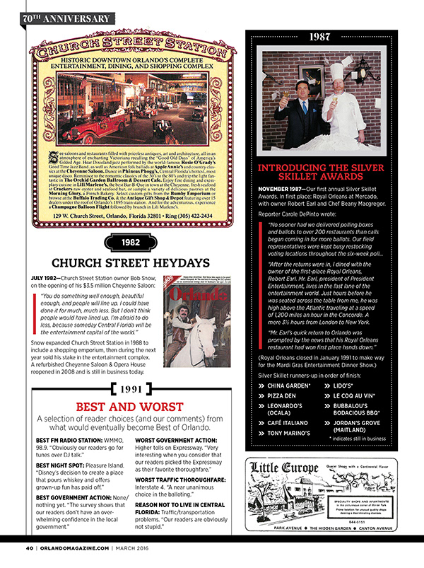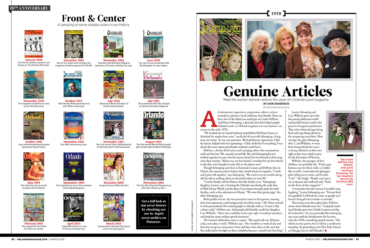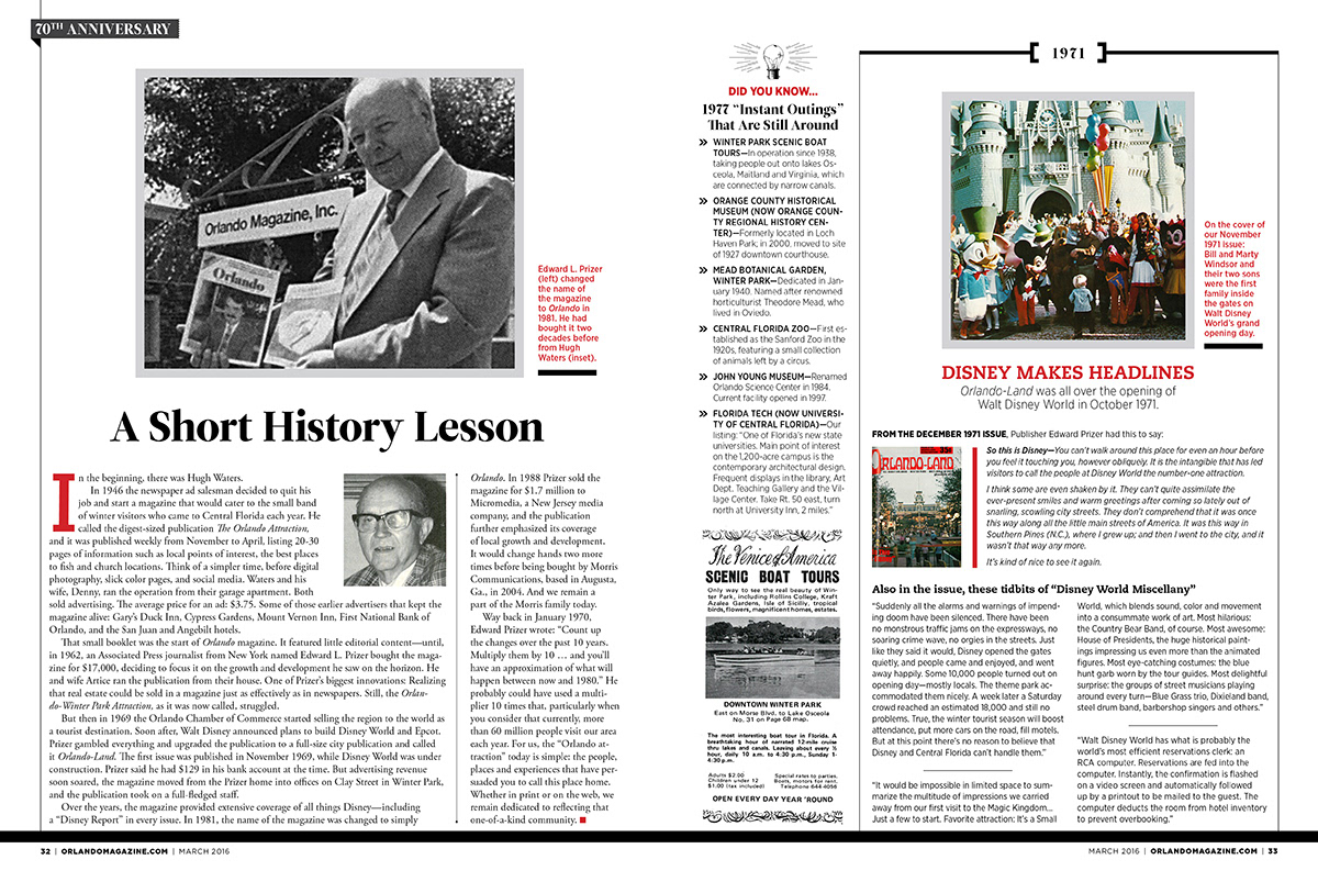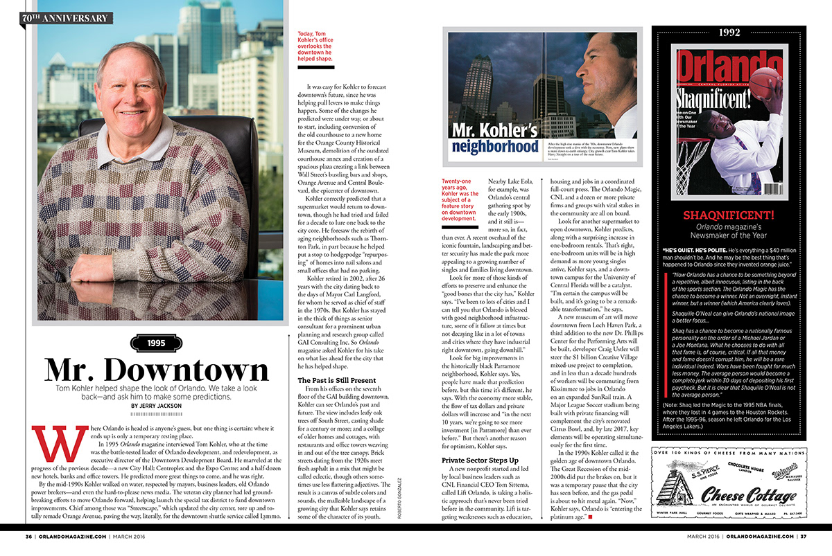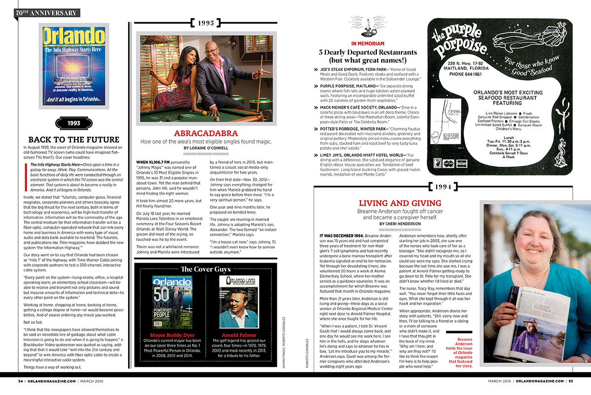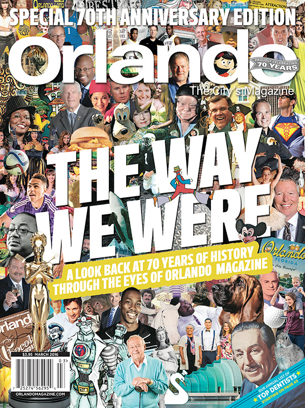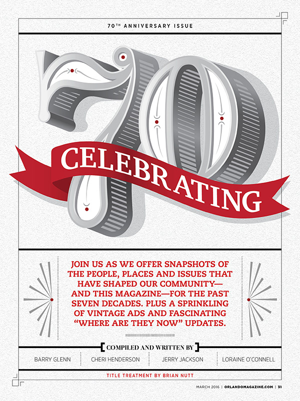 Cover college and feature editorial layout for the 70th anniversary issue of Orlando magazine.