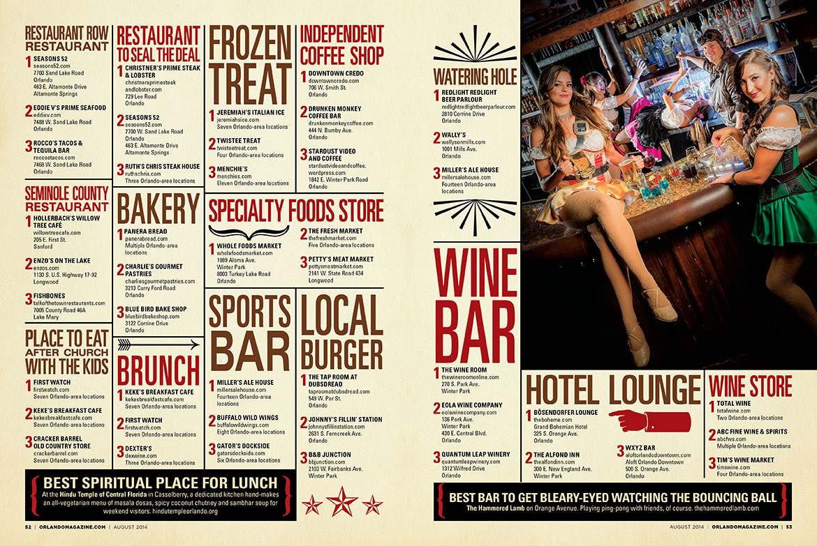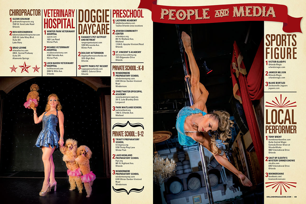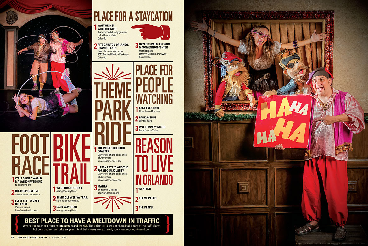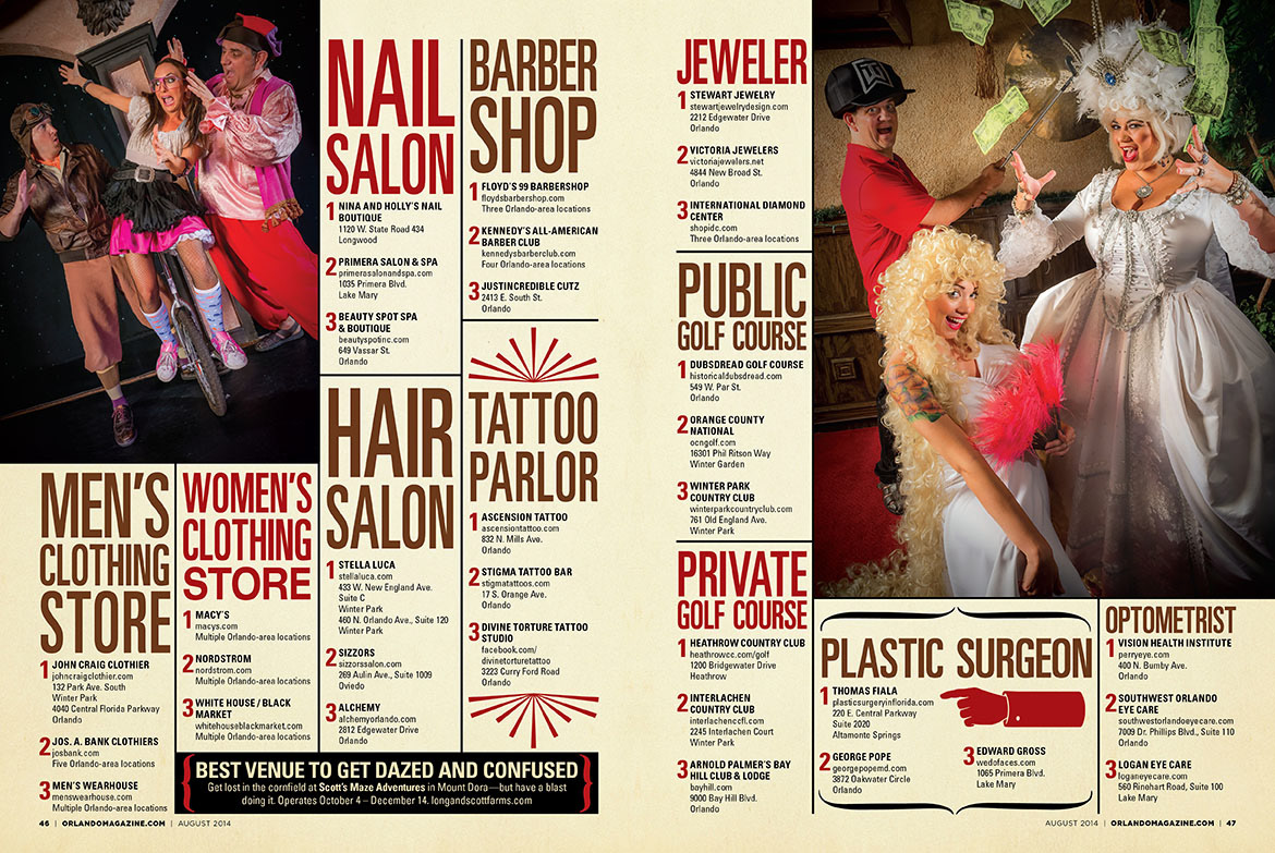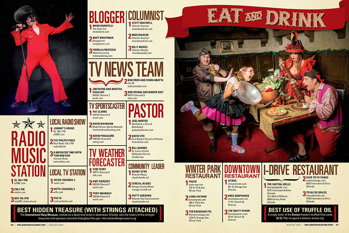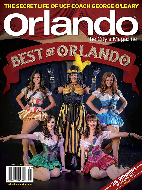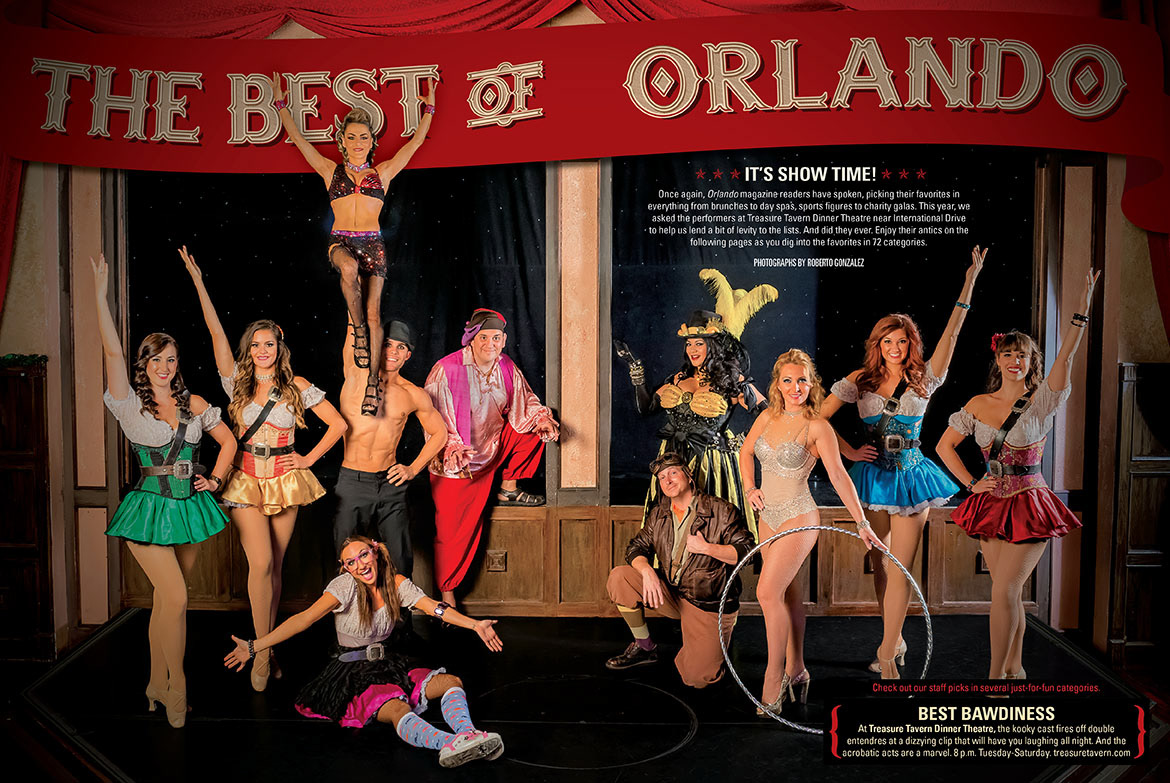 Best of Orlando cover and feature layout for the August 2014 issue of Orlando magazine (featuring the talented cast of Treasure Tavern).