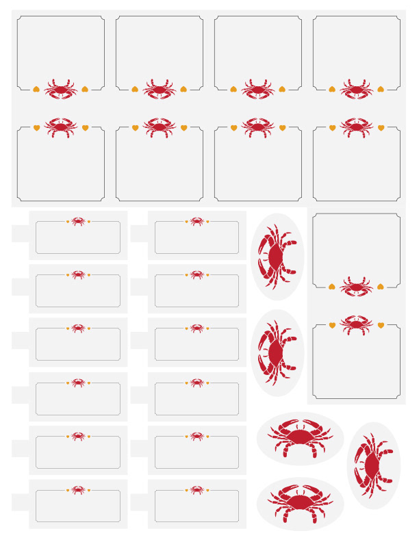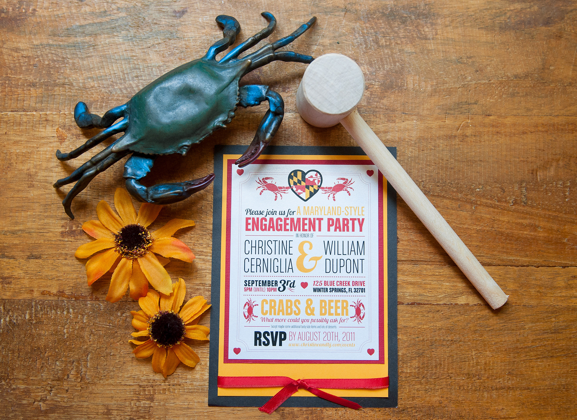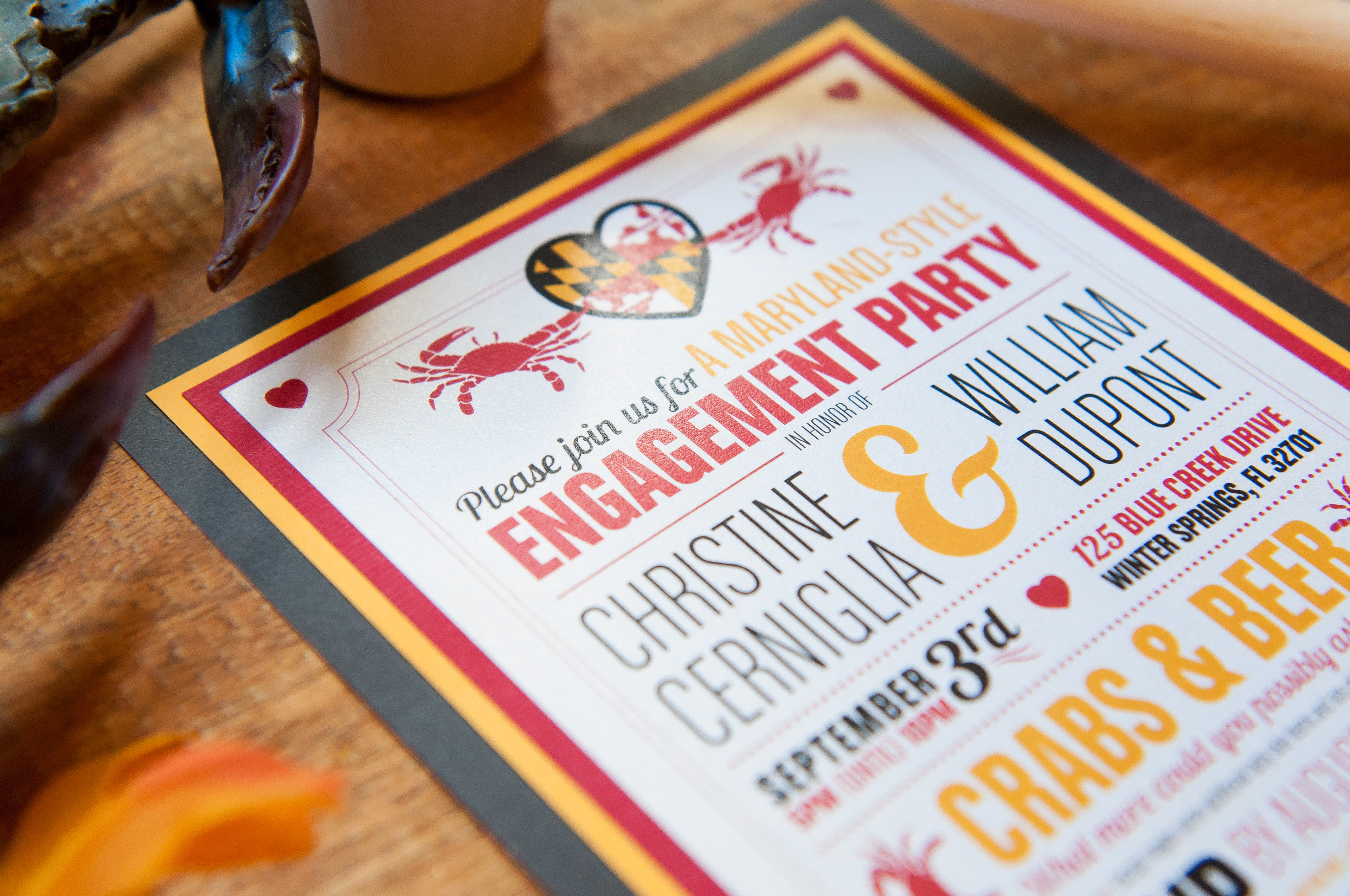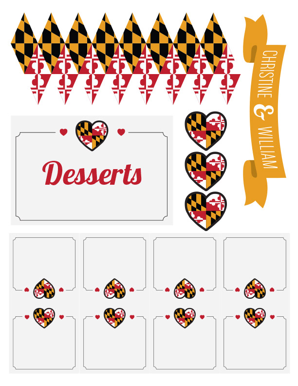 Maryland-themed engagement party invitation and printables. 5x7 matted invitation with ribbon embellishment and various printables, including table tents, bunting banner, cake topper banner, and toothpick flags.